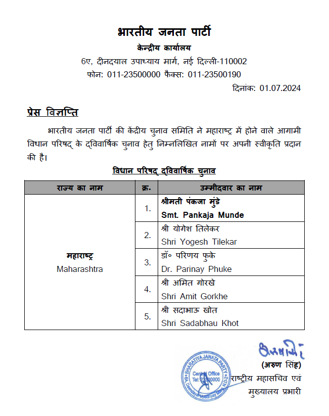 “BJP is pleased to announce its candidates for the Maharashtra Legislative Council biennial elections. Pankaja Munde, with her dedication and leadership, will bring invaluable insights and contribute significantly to the legislative process,” stated a BJP spokesperson.