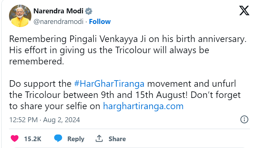 “Remembering Pingali Venkayya Ji on his birth anniversary. His effort in giving us the Tricolour will always be remembered,” Modi tweeted. The Prime Minister’s tribute was accompanied by a call to action for the public to participate in the Har Ghar Tiranga movement, an initiative aimed at celebrating the national flag and fostering a sense of national unity.
