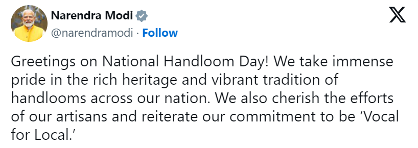 In a statement shared on the social media platform ‘X,’ Modi expressed pride in India’s diverse handloom heritage and the skilled artisans who keep these traditions alive. “Greetings on National Handloom Day! We take immense pride in the rich heritage and vibrant tradition of handlooms across our nation. We also cherish the efforts of our artisans and reiterate our commitment to be ‘Vocal for Local,’” the Prime Minister wrote.