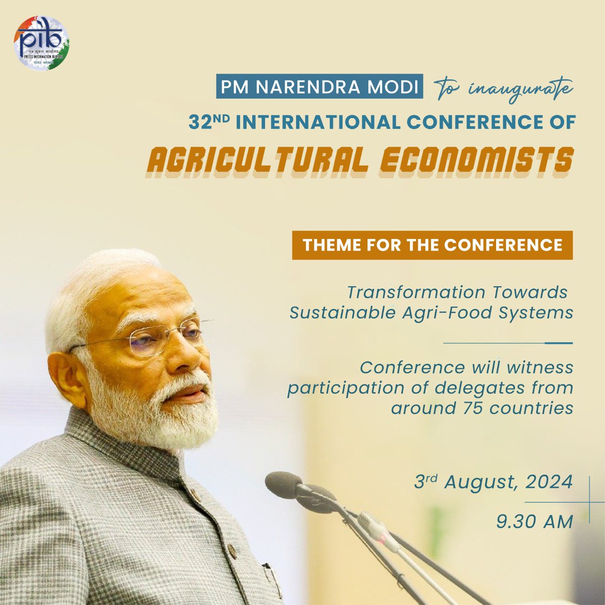 Prime Minister Narendra Modi is set to inaugurate the 32nd International Conference of Agricultural Economists (ICAE) on August 3, 2024, at the National Agricultural Science Centre (NASC) Complex in New Delhi. The inauguration will begin at 9:30 AM, with Prime Minister Modi also delivering a keynote address during the event.