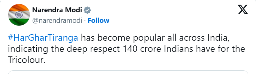 Prime Minister Modi responded to the post with a message of appreciation: “#HarGharTiranga has become popular all across India, indicating the deep respect 140 crore Indians have for the Tricolour.” His comments underscore the campaign’s effectiveness in uniting the country through a shared display of reverence for the Indian flag.