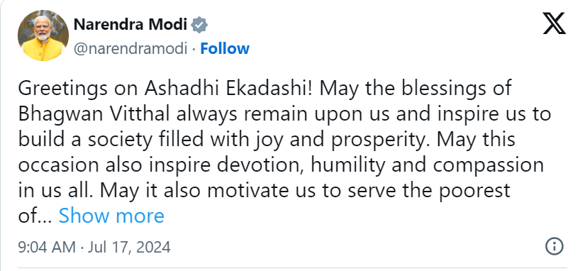 As the nation observes Ashadhi Ekadashi with devotion and fervor, PM Modi’s message serves as a reminder of the timeless values embedded in India’s spiritual heritage. His appeal for spiritual reflection and social harmony resonates with the ethos of compassion and communal unity, encouraging individuals to contribute positively to society.