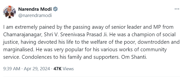 “Deeply pained by the passing away of senior leader and MP from Chamarajanagar, V Sreenivasa Prasad,” the Prime Minister tweeted. He praised Prasad as a stalwart of social justice, who dedicated his life to the upliftment of the poor, downtrodden, and marginalised.